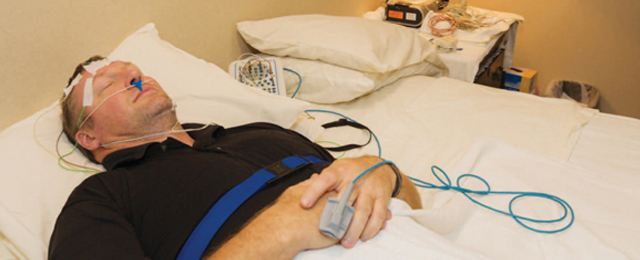 Sleep labs typically have a bedroom-like set-up with sensors and a monitor. These sensors are attached to the head of the patient using a mild adhesive. Usually the monitor kept discreetly, out of the direct sight of the patient to give a sense of a normal bedroom to the person.